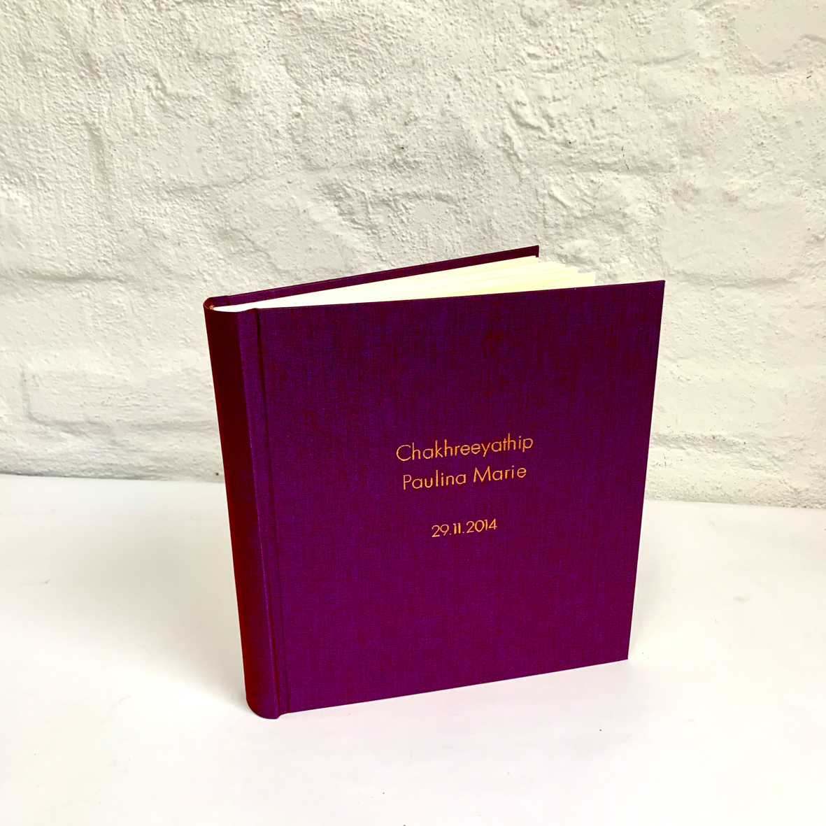 Wählen Sie Leinen für die natürliche Anmutung oder Bibliotheksleinen, wenn es robuster sein soll: Bibliotheksleinen hält viel aus und lässt sich vorsichtig abwischen, während klassische Leinenstoffe etwas fleckenempfindlicher sind. Namen, Daten und kleine Ornamente wie Sterne oder Schneeflocken präge ich heiß in der Typografie die Sie aussuchen - um ein langlebiges persönliches Album zu gestalten.