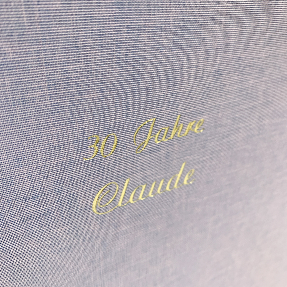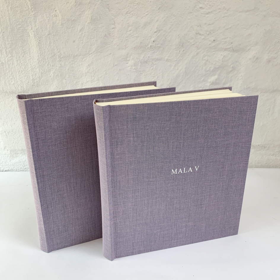 Der Hardcover-Einband besteht aus hochwertigem zweifarbigem Leinen in Flieder – langlebig, zeitlos und edel. Auf Wunsch veredeln wir Ihr Album mit einer heißen Prägung: Name des Kindes und/oder Geburtsdatum werden spürbar aufgebracht. So wird aus dem kleinen Fotoalbum ein einzigartiges Unikat.