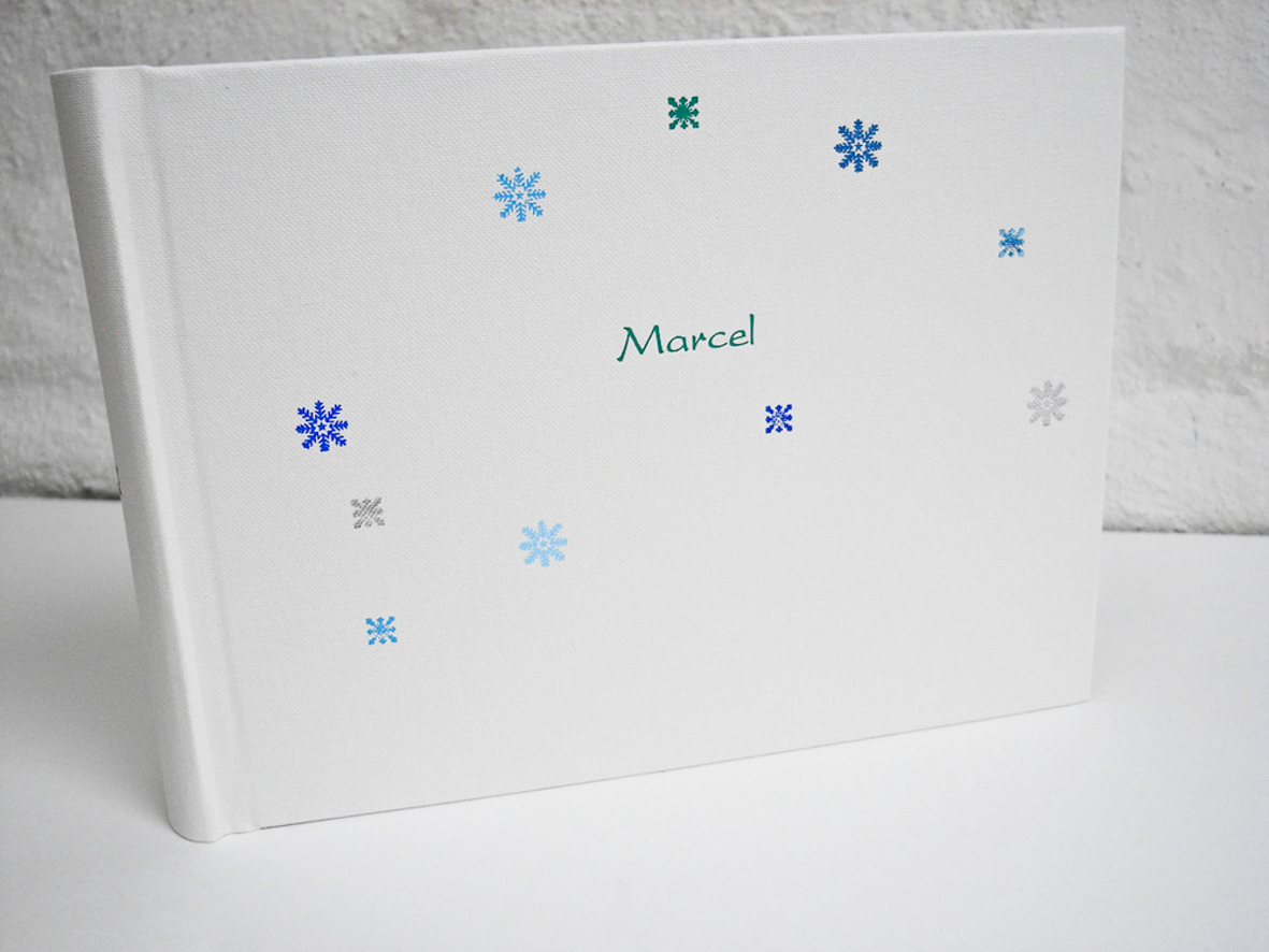 Der Einband ist aus Bibliotheksleinen, was lange hält und schön aussieht. Er glänzt ganz leicht, ist robust und lässt sich gut entstauben und sogar mal vorsichtig abwischen. Die Prägung mache ich heIß. So dass man den Namen fühlen kann. Sterne, Schneeflocken und andere Verzierungen mache ich im selben Verfahren. Alles wird per Hand in unserer Werkstatt in Hamburg geprägt.