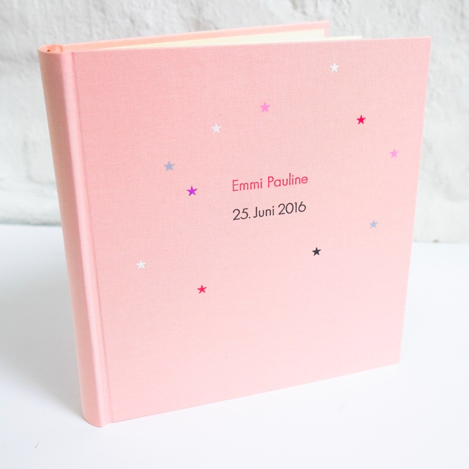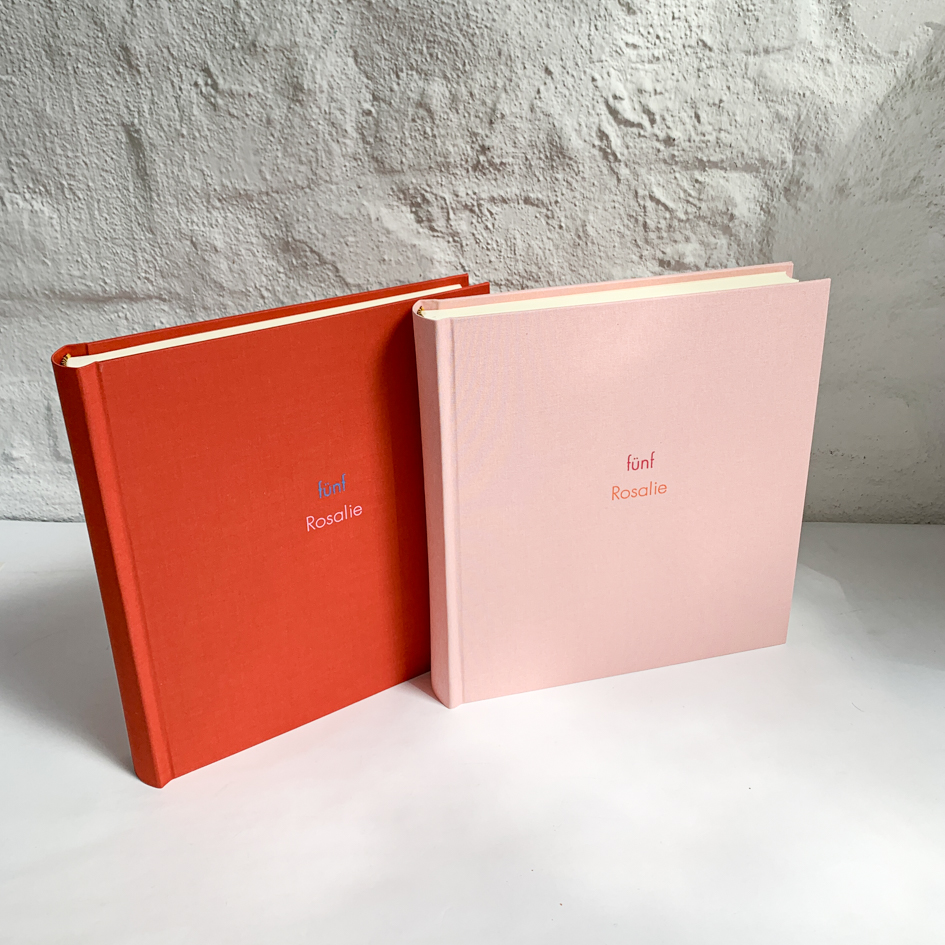 Die Prägung mache ich heiß, so dass sich die Bleibuchstaben in das Leinen eindrücken. Man kann Namen und Datum also leicht fühlen. Die Kreise und Sternchen auch. Die Größe ist 22 X 24,5 cm, der Rücken ist 4 cm und leicht gebogen.