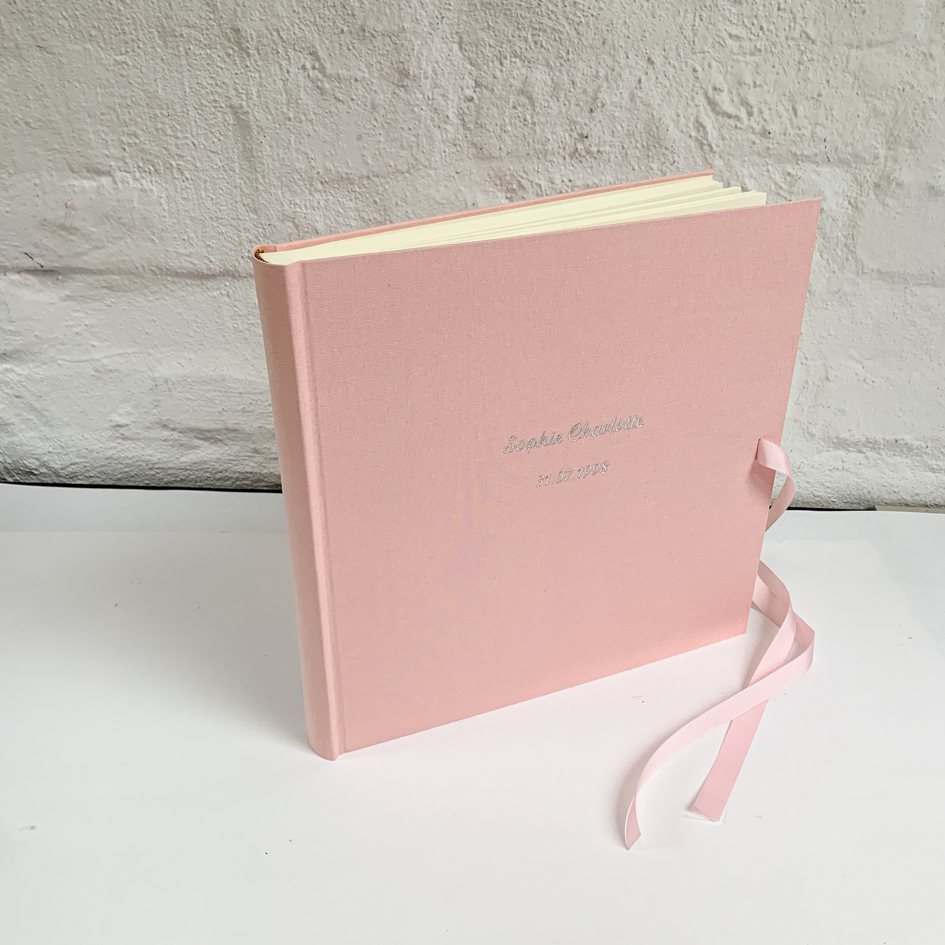 Ein fast quadratisches Fotoalbum mit Ganzbezug aus Buchbinder-Feinleinen. Auf Wunsch mit einer Schleife zum Zubinden aus Satin oder Ripsband. Natürlich geht es auch ohne Schleife.