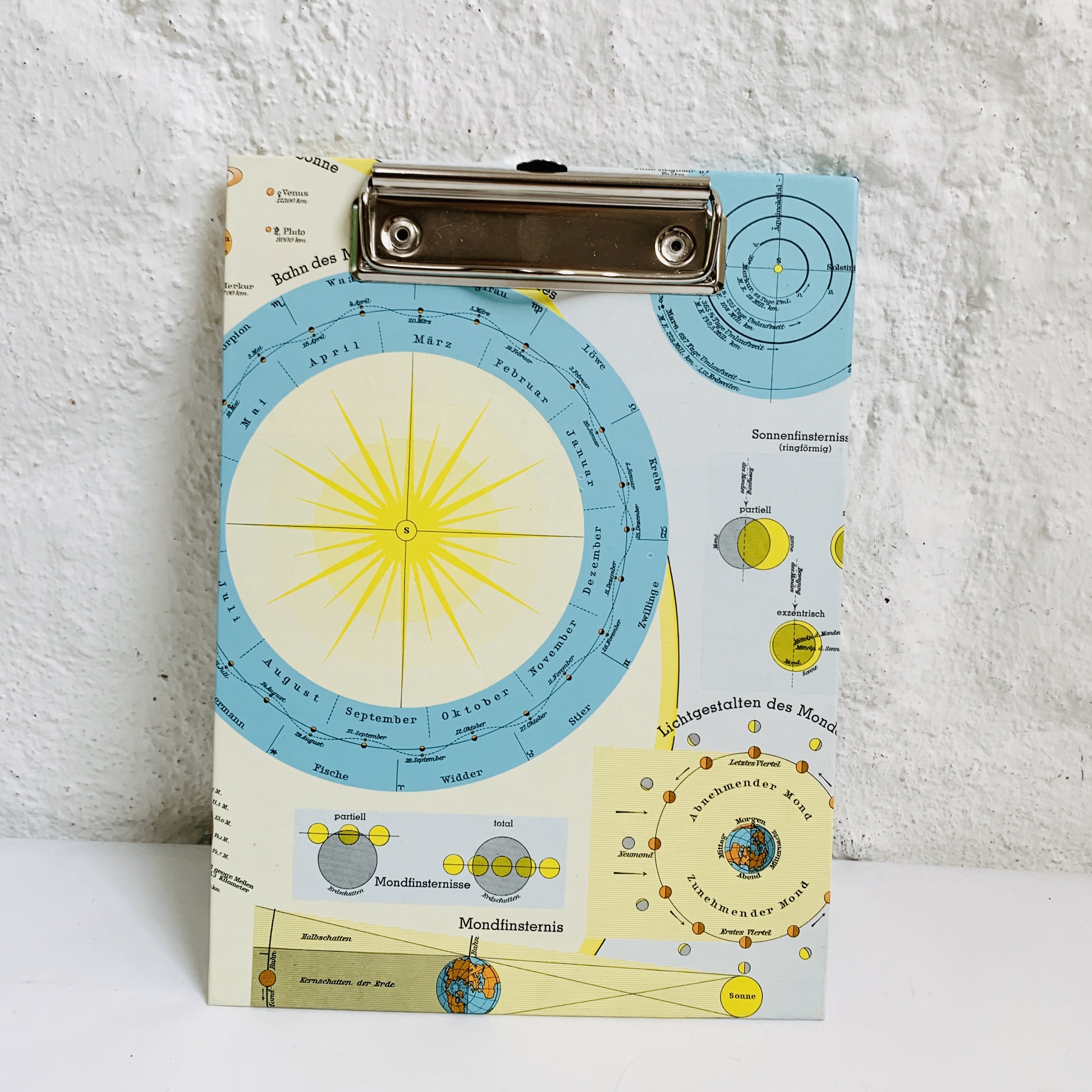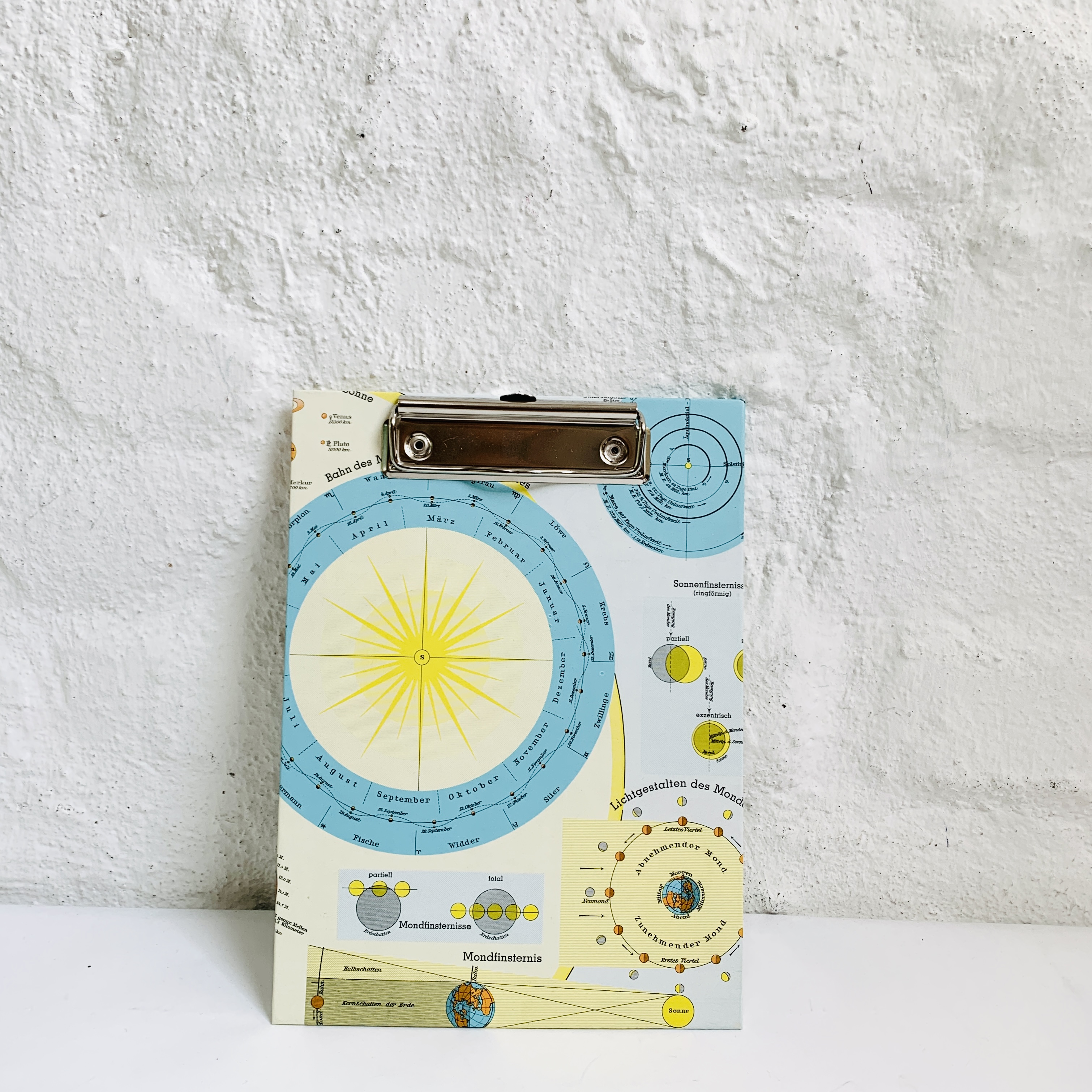 Jedes unserer handgefertigten Klemmbretter ist ein echtes Unikat – liebevoll hergestellt in Hamburg aus einer alten Mondkarte, die Karte erklärt die Monfinsternis; aus einem historischen Schulatlas. So wird jedes Stück zu einem kleinen Kunstwerk mit Geschichte und Charakter.