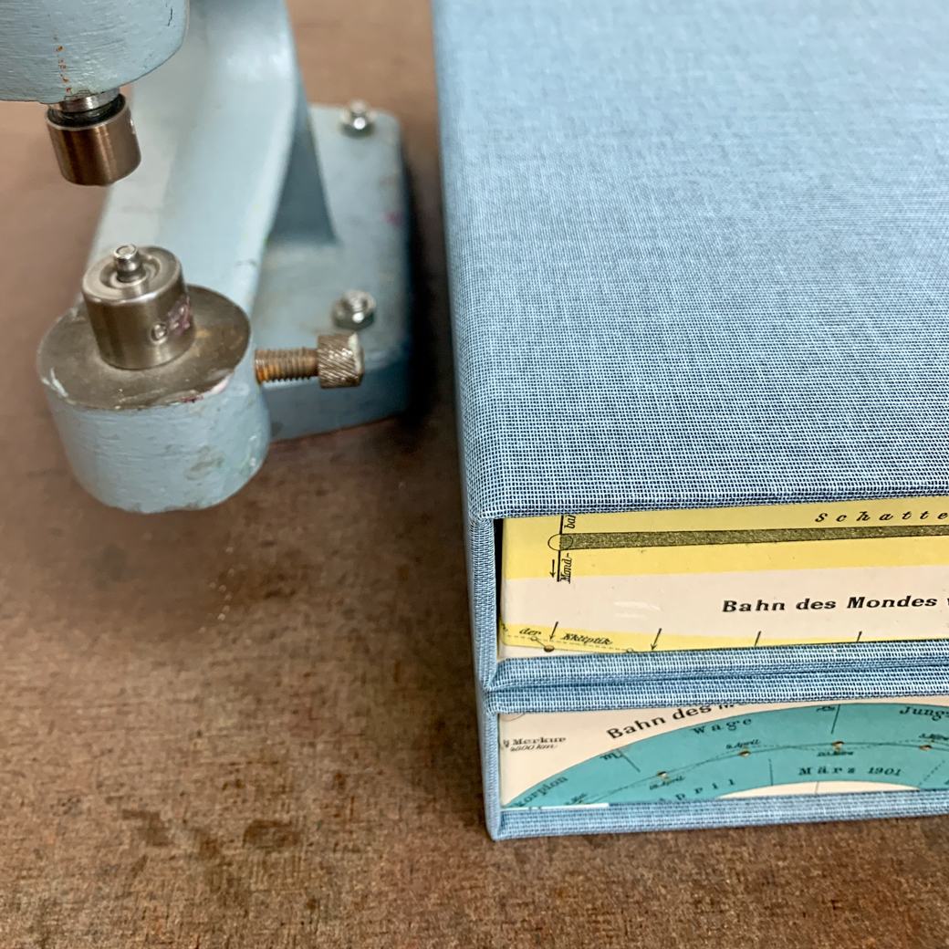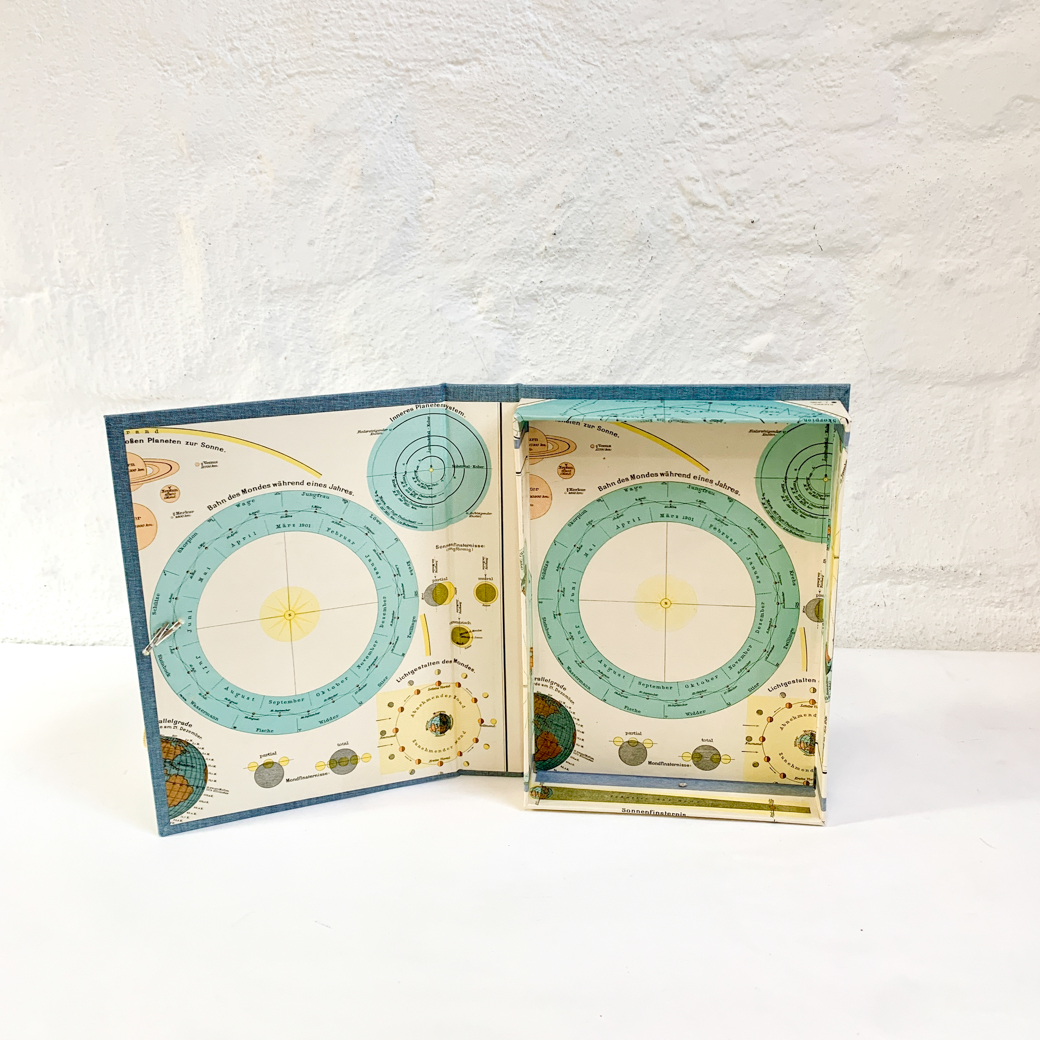 Ein Unikat aus Hamburg: Diese handgebaute Kiste aus einer sehr alten Karte zeigt die Bahn des Mondes und das innere Planetensystem in zarten Staubpastellfarben – helles Jeansblau mit sanftem Gelb. Jede Kiste wird in sorgfältiger Handarbeit gefertigt und ist bewusst analog und unperfekt, mit feinem, haptisch weichem Papier – ein echtes Highlight der Papeterie.